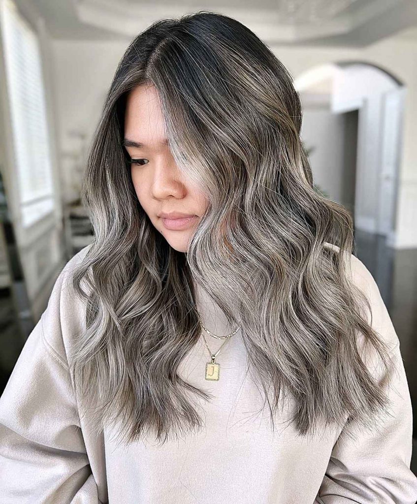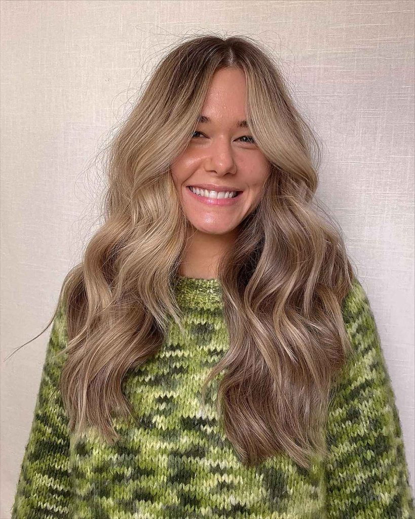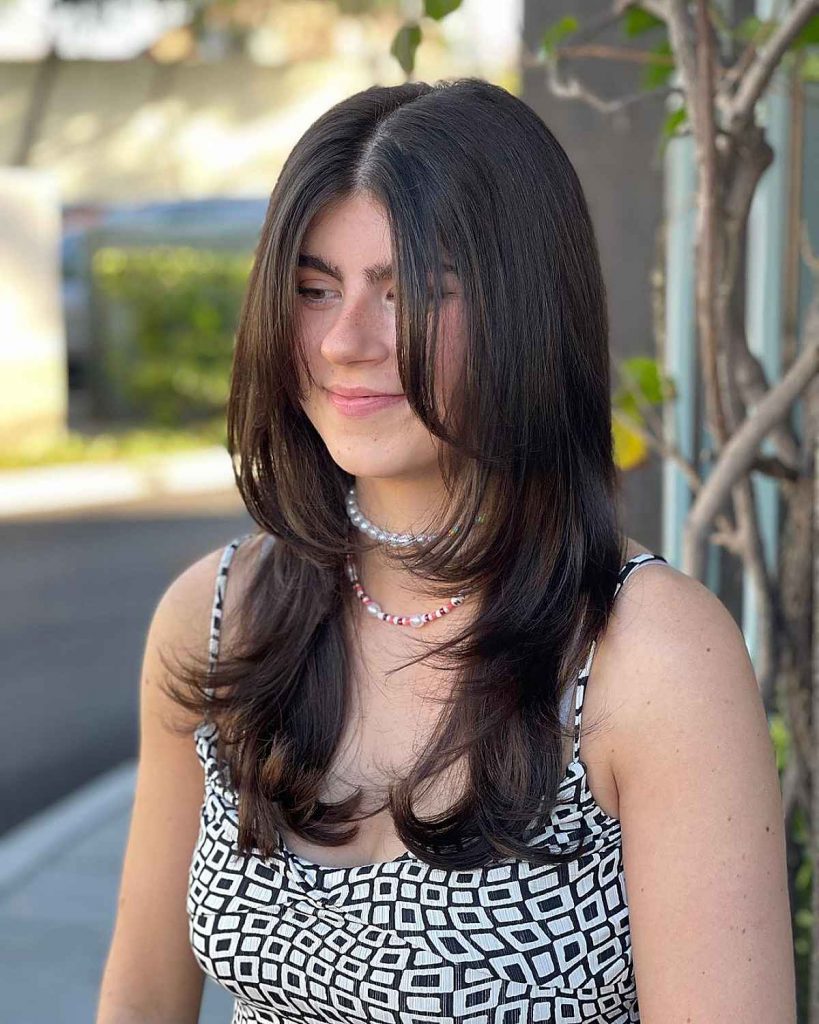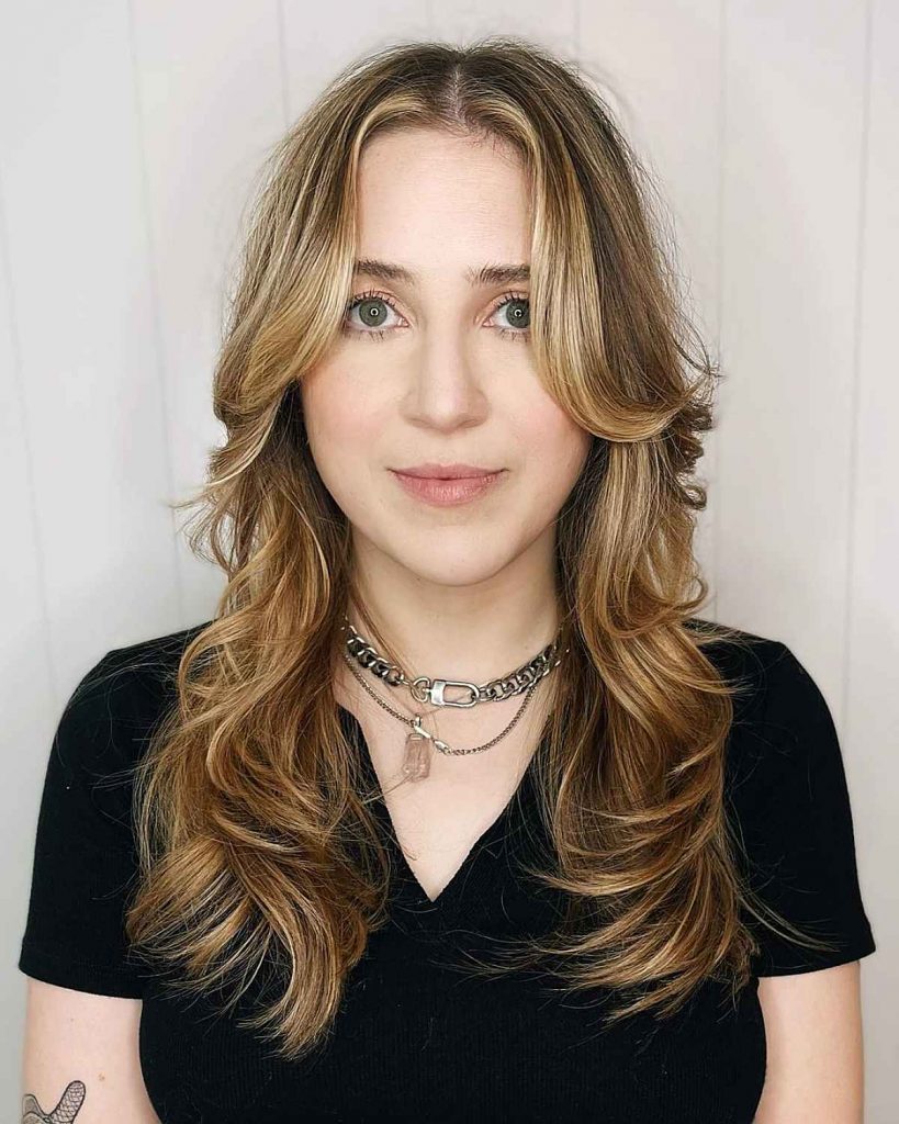Center-parted long hair with layers and loose waves is a very trendy style. It’s definitely a great choice if you’re tired of a blunt cut. Middle parts keep your hairline thicker while layers and waves blend seamlessly to frame the face and add texture and body to tresses.