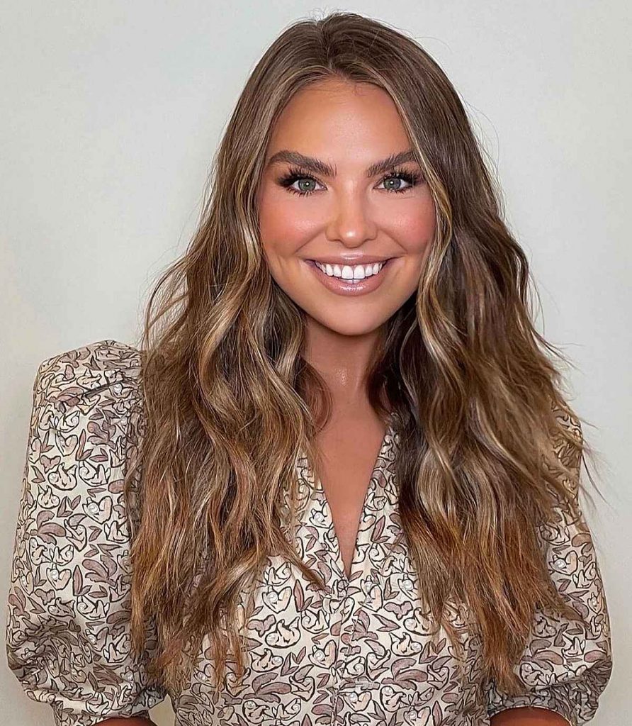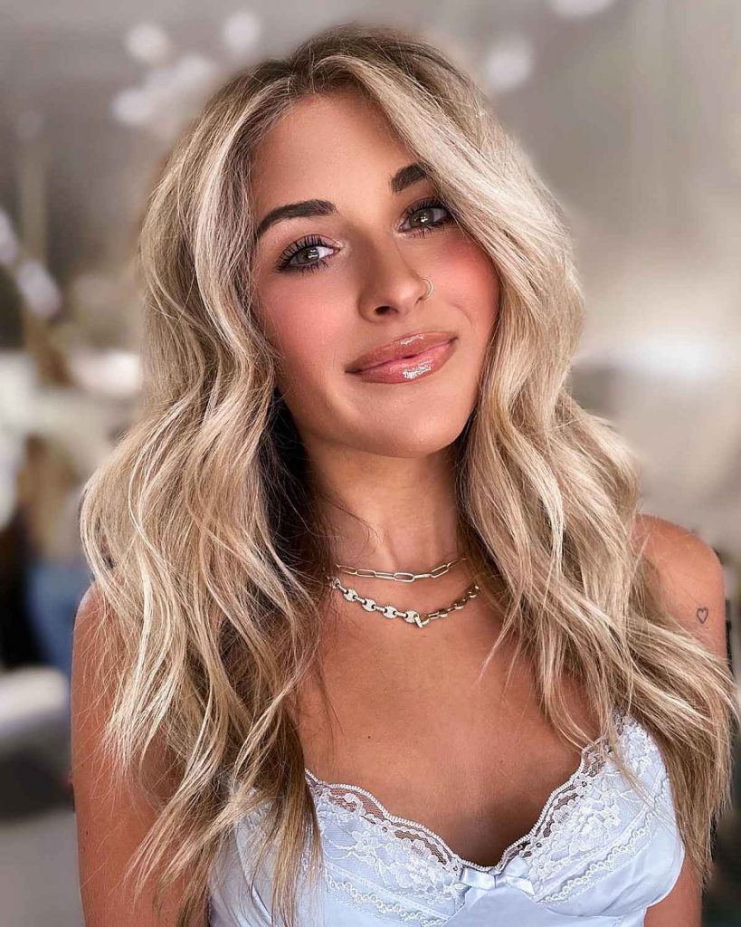Long wavy layers with blonde face-framing pieces brighten up hair and skin. Light face-framing within the haircut creates a volume that compliments elongated faces by adding more to the shape instead of creating harsh boxy lines.