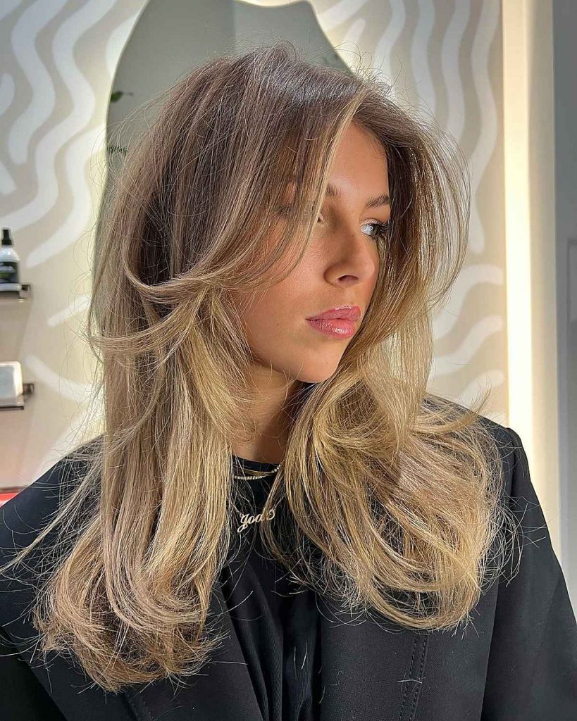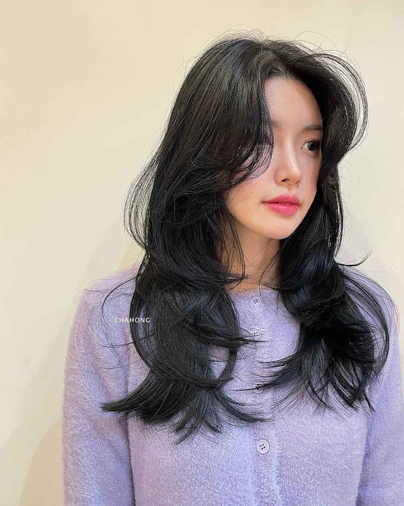 Face-framing and swoopy layers make a more dramatic version of long layered haircuts. Front layers are cut shorter around the face, grazing the chin, to create more movement and result in an effortless style.