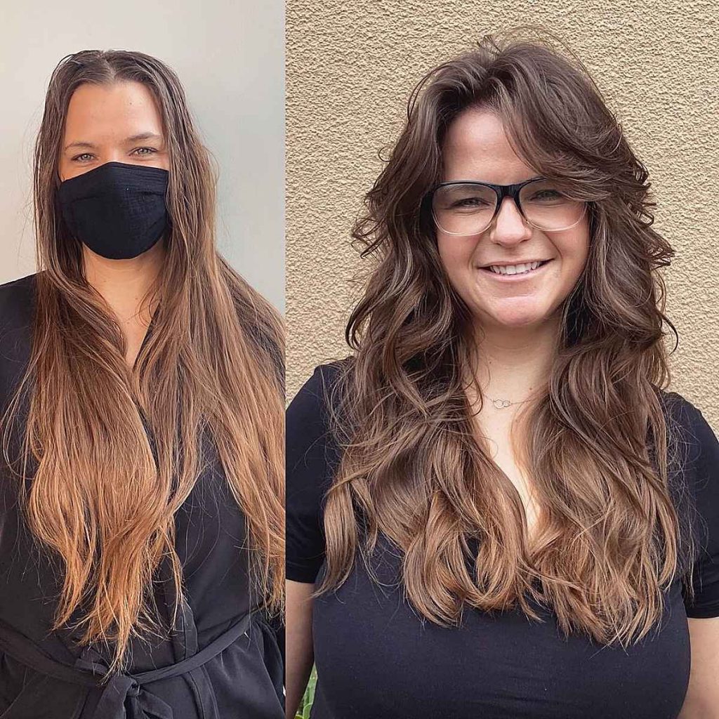 Layered hair with face-framing bangs is a trendy, softer look consisting of shorter dramatic layers only around the face and a long curtain bang. These short face-framing layers for long hair allow for a much voluminous finish that looks natural on straight to wavy hair types. Such long layered hair with bangs also maintains your normal length in the rest of the haircut.