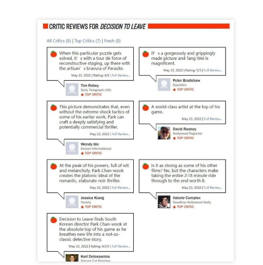 The Daily Telegraph (UK): A+ performance by Tang Wei, with a great ending scene.